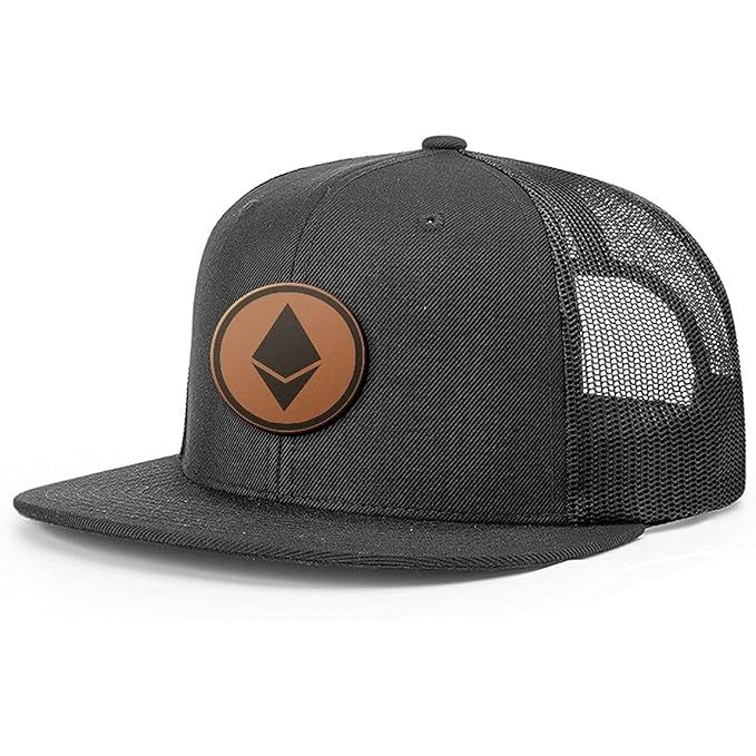 BustedTees Ethereum Leather Patch Flatbill Back Mesh Hat Baseball Cap