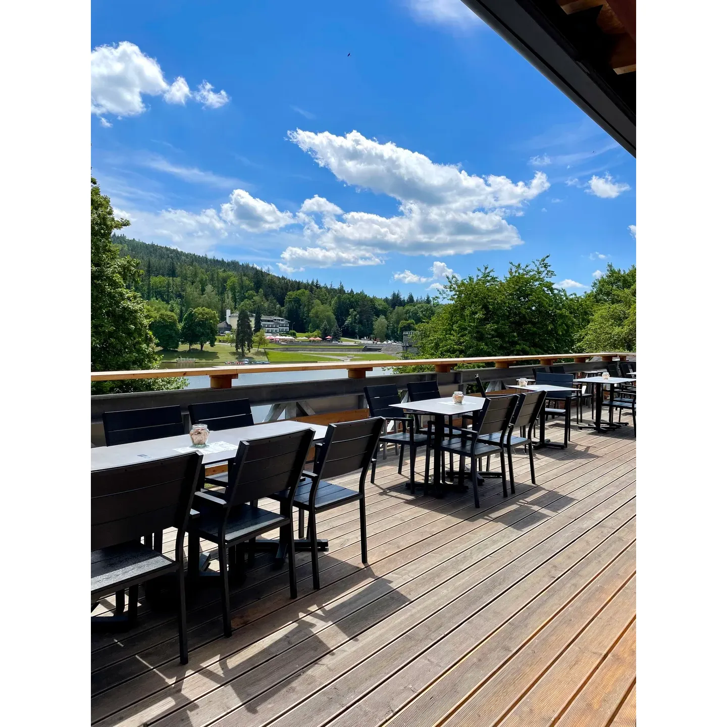 Visitors from near and far, including international guests, are impressed by the cafe's prime location, which boasts stunning views of the nearby lake and provides a cool, shaded oasis to beat the heat. Drinks like iced tea receive special mention for their refreshing flavor and attractive presentation, while the option of service in English adds a layer of convenience for those from abroad.