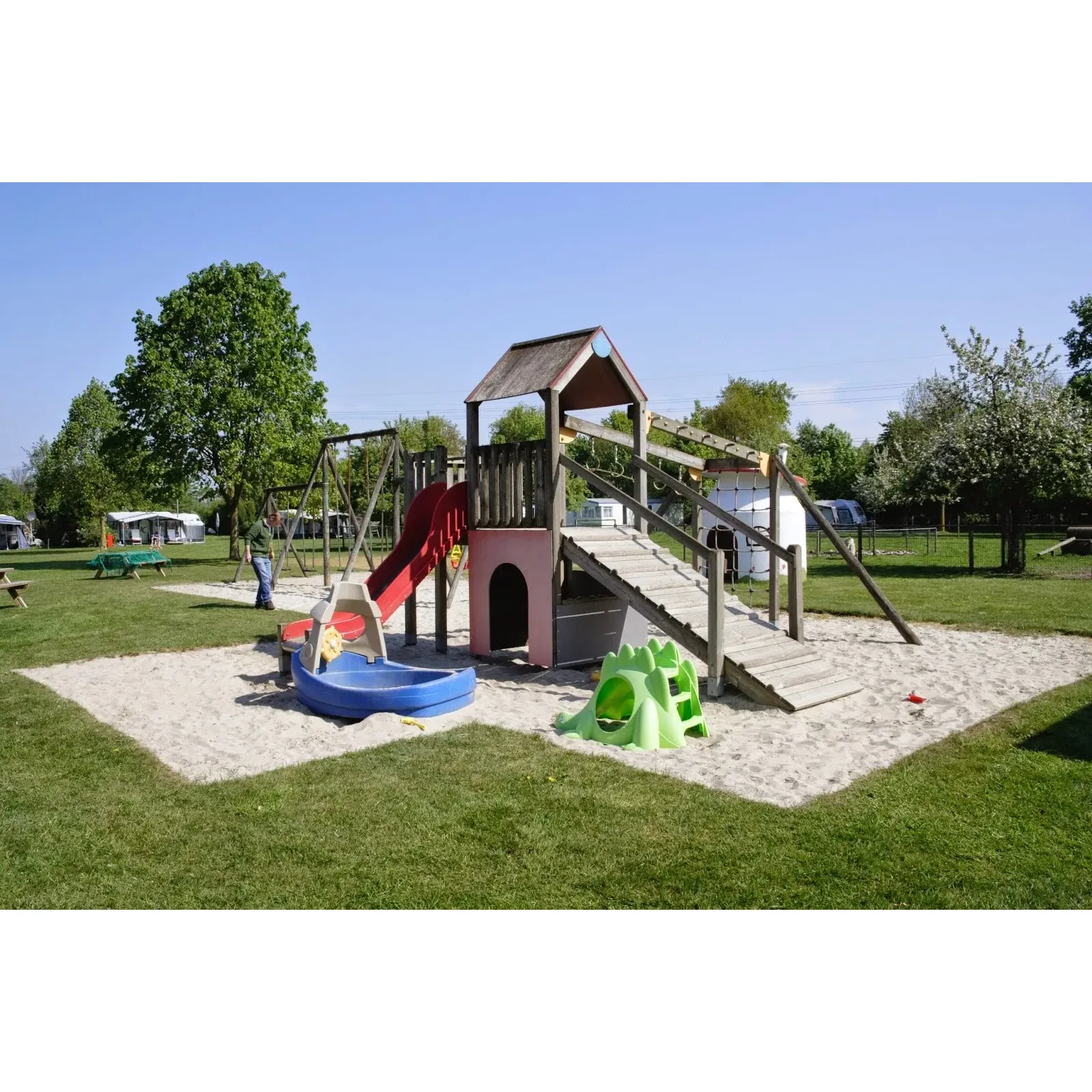 Spanning a generous expanse, the campsite boasts beautifully spacious pitches, providing ample room for caravans and tents. Guests can expect well-maintained and manicured grounds that invite relaxation and leisure. Children are delighted by the onsite playground, an area brimming with creative play structures that provide hours of entertainment. Adding to the wholesome atmosphere, an array of friendly small animals roams the site, offering a charming touch to the natural scenery.