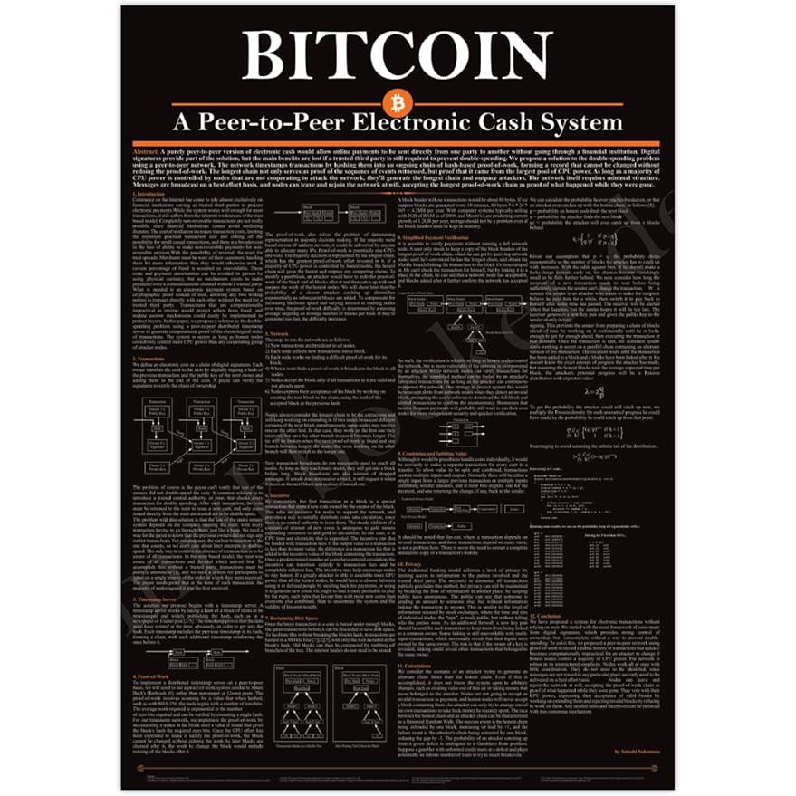 The Bitcoin Poster | Bild Krypto Whitepaper Black is a 24x18 inch poster that features a design inspired by the original Bitcoin whitepaper, written by the mysterious creator Satoshi Nakamoto. The poster has a sleek black and white color scheme with intricate graphics that represent the blockchain technology behind Bitcoin. It serves as a visual representation of the groundbreaking concept of decentralized digital currency.