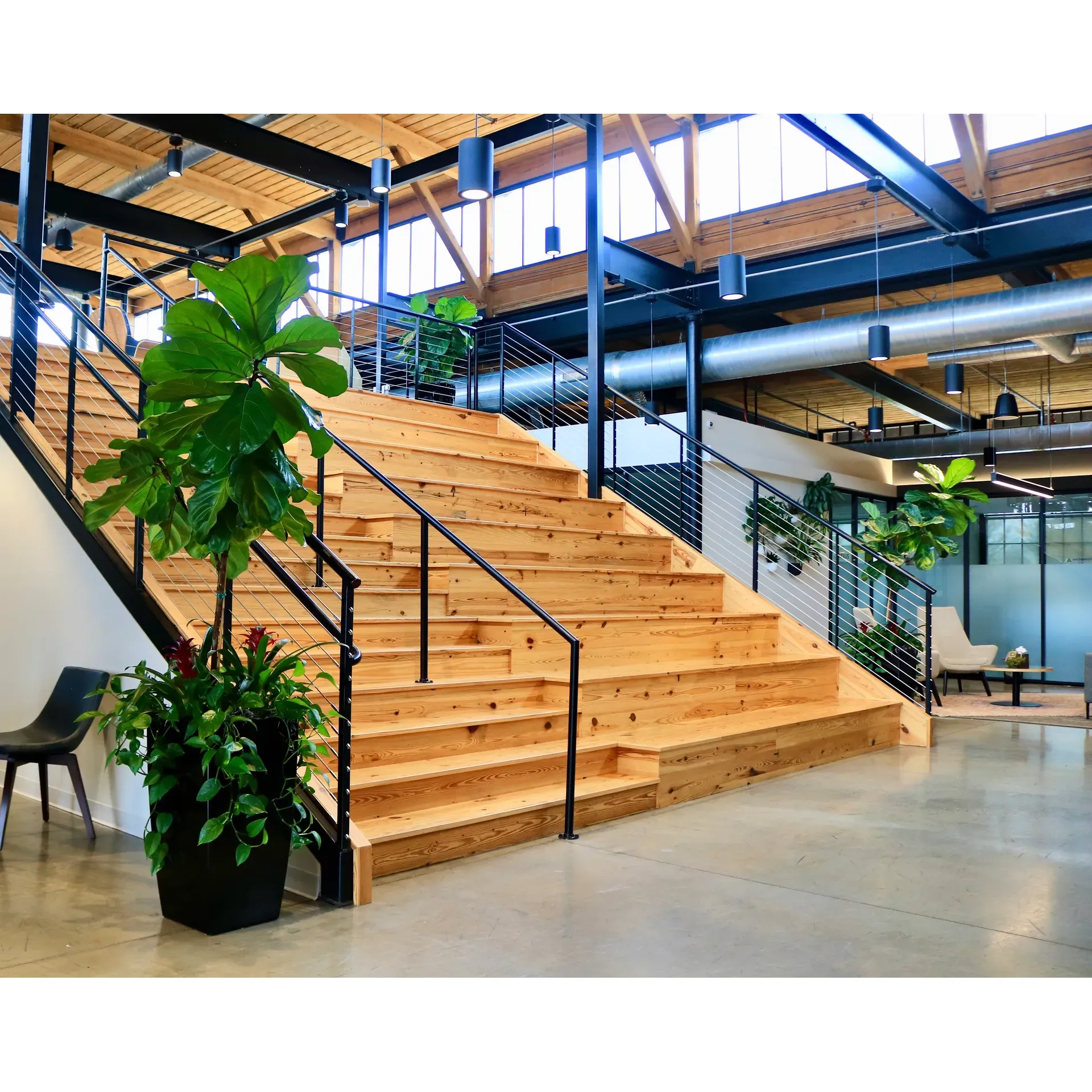 Inside, visitors find a bright and vibrant setting, often compared to an upscale, eclectic coffee shop that encourages productivity and networking. The thoughtfully curated furnishings provide a comfortable yet upscale atmosphere, offering a mix of retro and contemporary styles that both inspire and honor the building's storied past. Substantial indoor greenery brings a touch of nature indoors, while state-of-the-art lighting ensures a well-illuminated workspace at any time of the day.